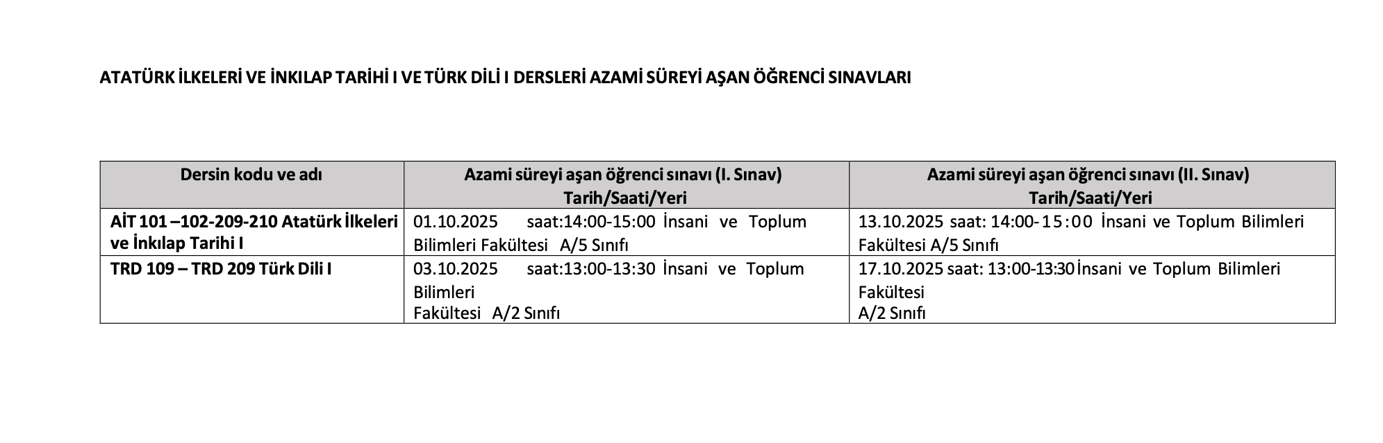 Azami öğrenim süre sonu sınavları (1. Ek Sınavlar): 17 Şubat - 23 Şubat arası 29 Eylül - 05 Ekim arası