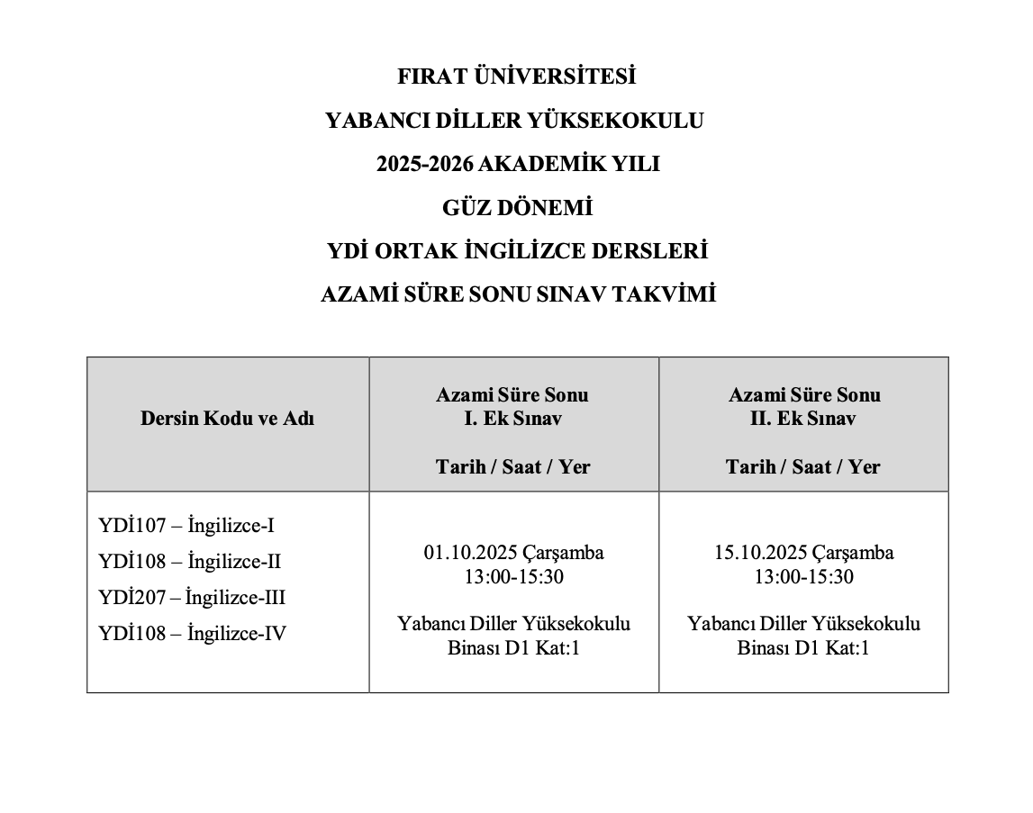Azami öğrenim süre sonu sınavlarına girecek öğrencilerin 26 Eylül Cuma günü mesai bitimine kadar okulumuz öğrenci işlerine elden veya mail olarak (shmyo@firat.edu.tr) dilekçesini teslim etmesi gerekmektedir.